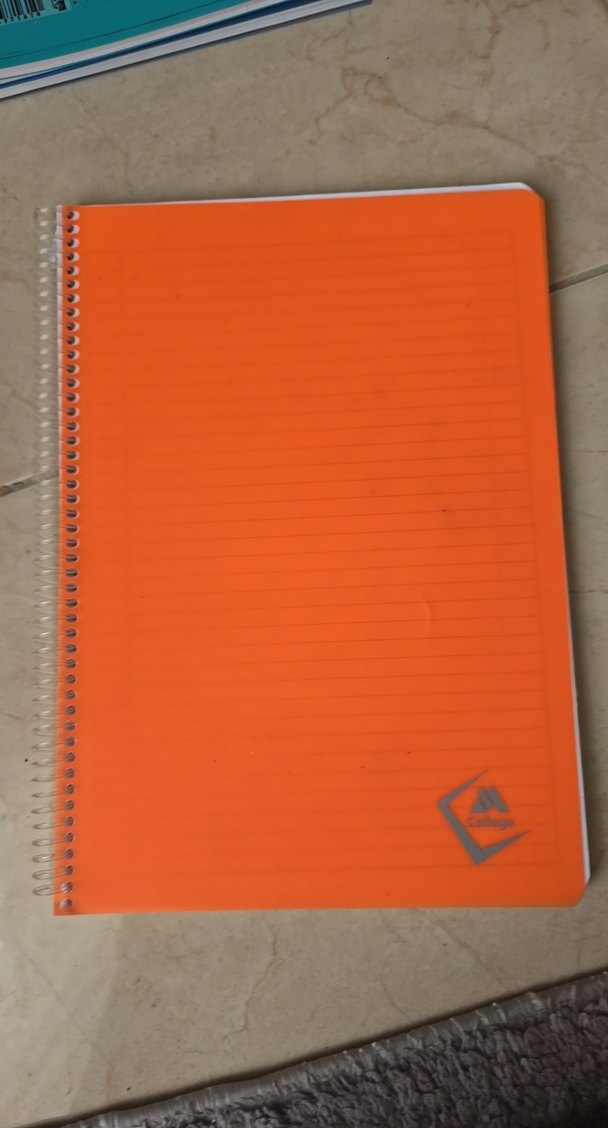 Parlak turuncu kapaklı, spiralli ve çizgili sayfalı defter.