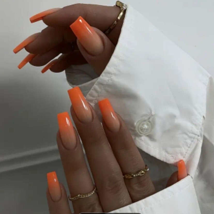 Tırnaklara parlak ve canlı turuncu renk katan tırnak süslemeleri. Cesur ve renkli bir görünüm için uygundur.