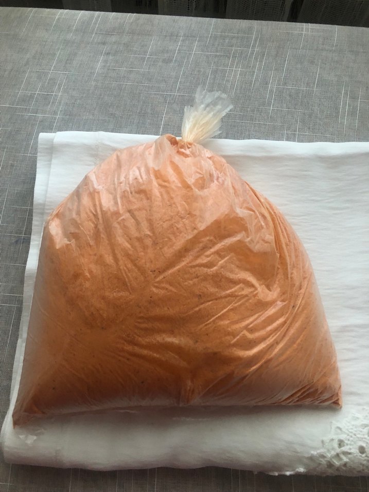 Parlak turuncu renkte ince toz, şeffaf plastik poşette paketlenmiştir. Canlı renklidir.hepsi organik bahçeden