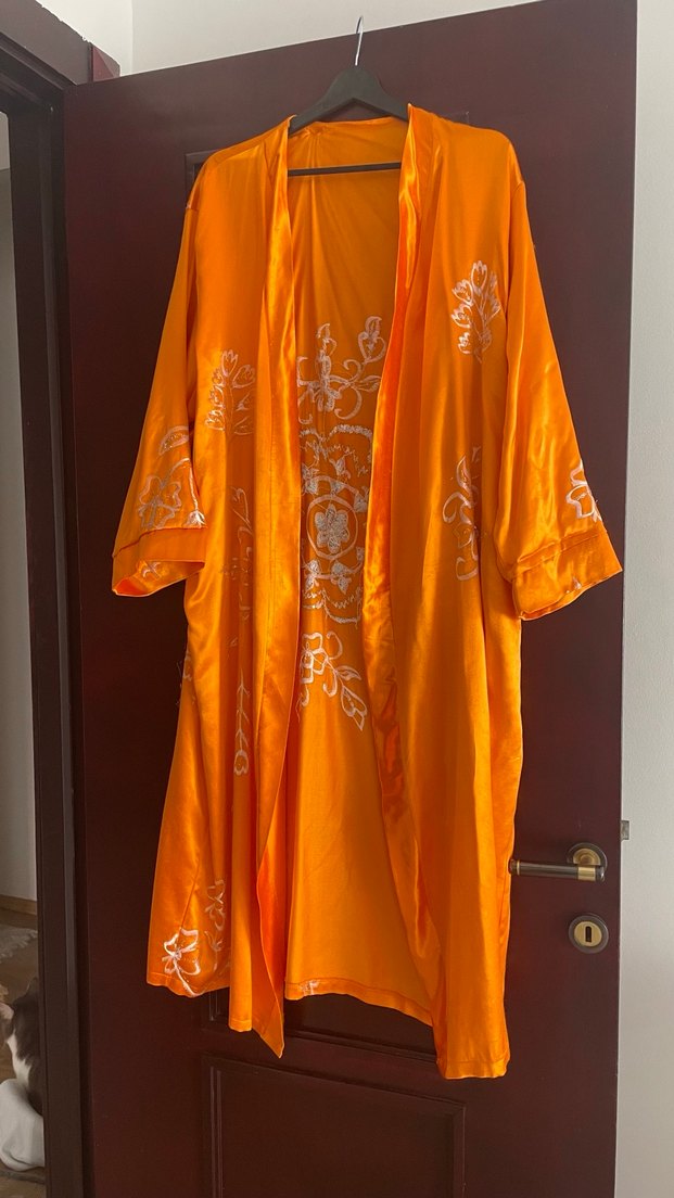 Parlak turuncu renkli, uzun ve bol kesim kadın sabahlık, uzun kollu ve bohem tarzıyla öne çıkar.