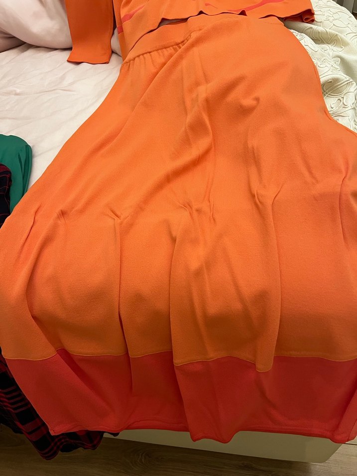 Parlak turuncu renkte, ince ve dökümlü kumaştan yapılmış uzun, bol kesim hamile eteği, günlük kullanım için uygundur.