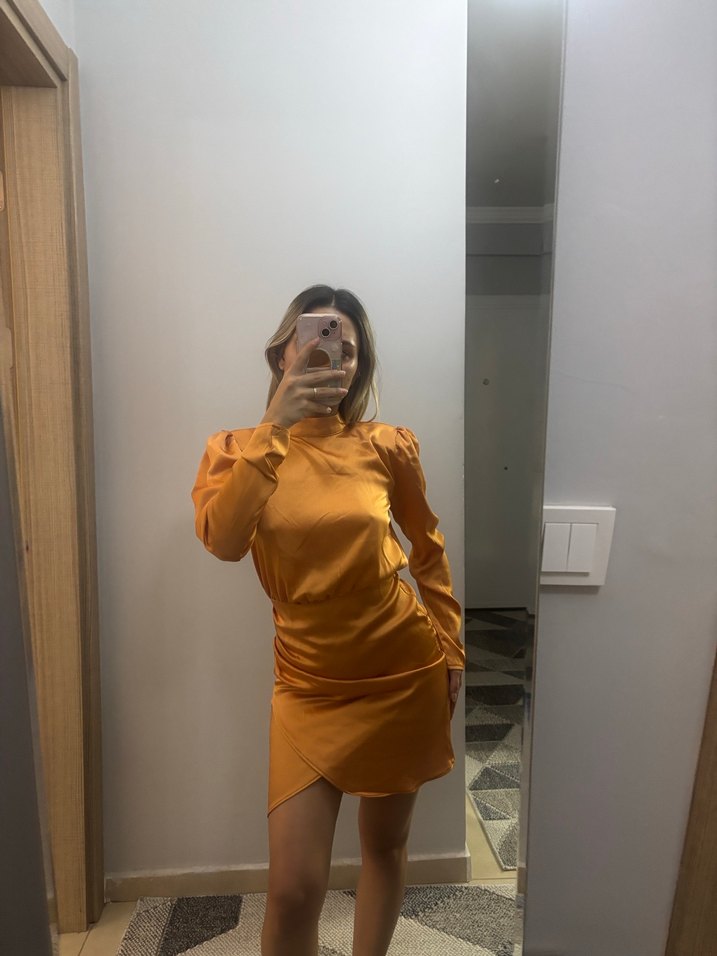 Parlak turuncu, yüksek yakalı ve uzun kollu, satenimsi kumaştan yapılmış, vücuda oturan midi elbise. Romantik akşamlar için zahmetsiz şıklık sunar. Boy 163 kilo 51