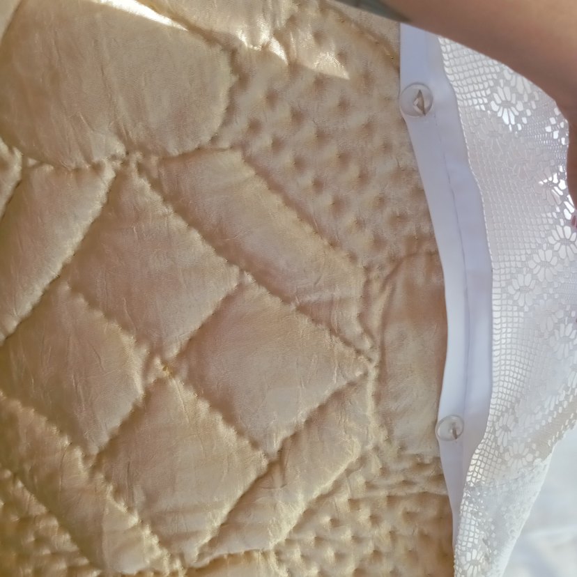 Parlak uçuk sarı renkte, desenli yün yorgan, Düğmeli beyaz kenarı işlemeli ve kapitone dokusuyla tasarlanmıştır. ️dantelli er örgüsü , ilikli düğmeli kaplı yün yorgan sıfır hiç kullanılmadı, pazar payı vardır