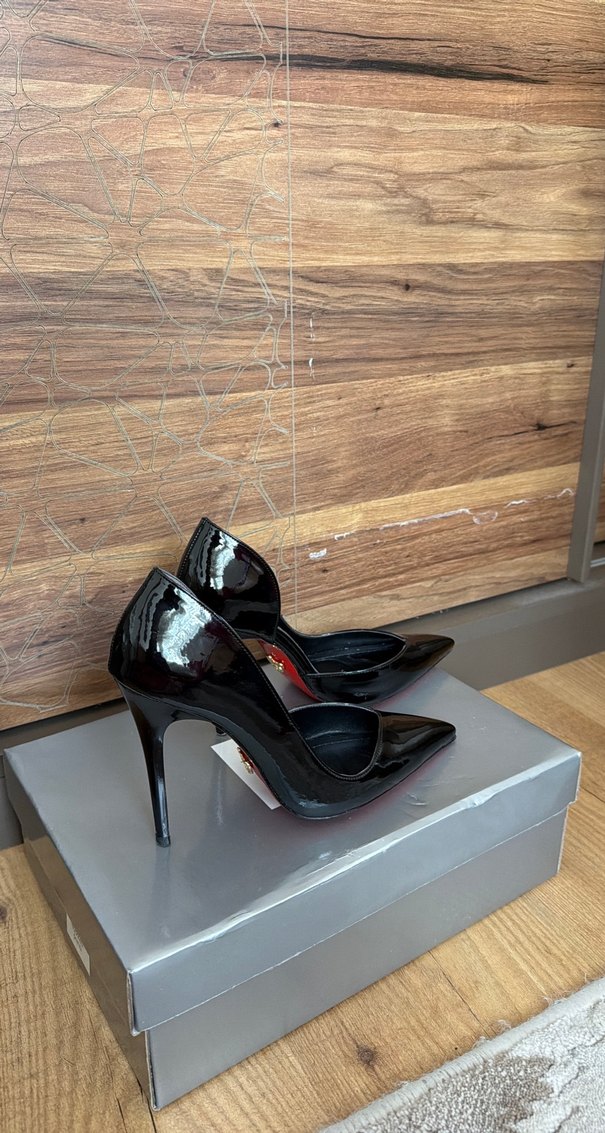Parlak siyah rugan altı kırmızı ince topuklu ayakkabılar, çağdaş görünüme sahip, romantik gece için ideal.