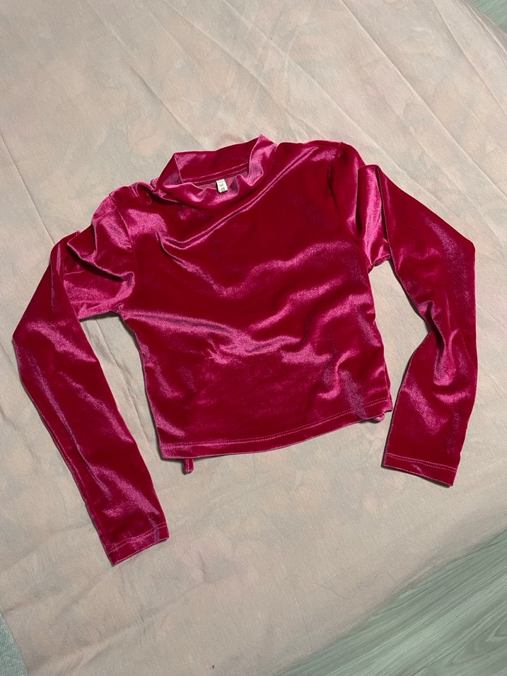 fuşya pembe parlak kadife kumaştan, yüksek yakalı ve uzun kollu, vücudu saran bel detaylı bluz