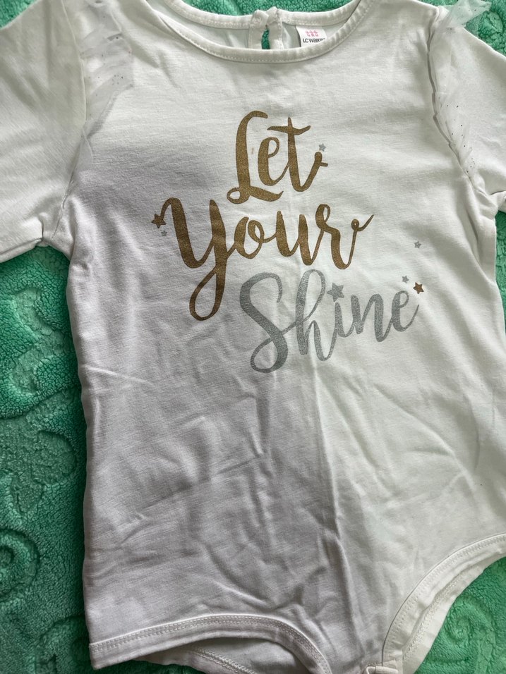 Kısa kollu, yuvarlak yakalı beyaz kız bebek body, parlak yazılı ve pul detaylıdır.