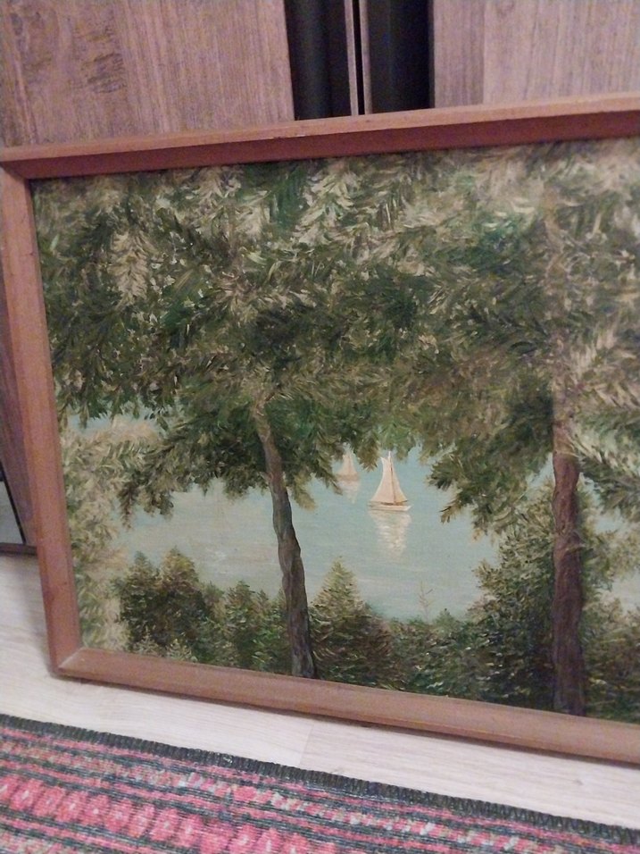 Parlak yeşil ağaçların önünde küçük bir yelkenli teknenin olduğu tablo. Ahşap çerçeve doğal görüntüyü tamamlıyor.