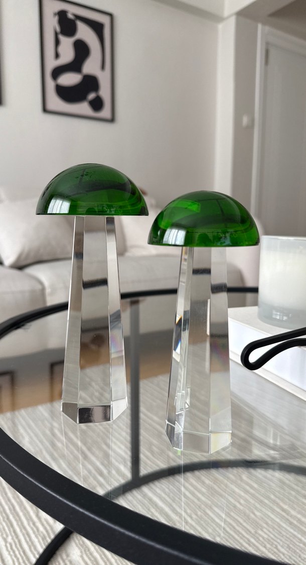 Parlak yeşil kubbeli başlık ve şeffaf açılı tabanlı modern obje. Her odaya çağdaş bir dokunuş katar.