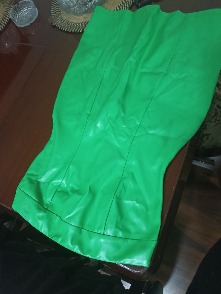 Parlak yeşil sentetik kumaştan, fermuarlı, biker tarzı uzun ve dar kesim hamile eteği. ️rugan elbise sıfır ürün