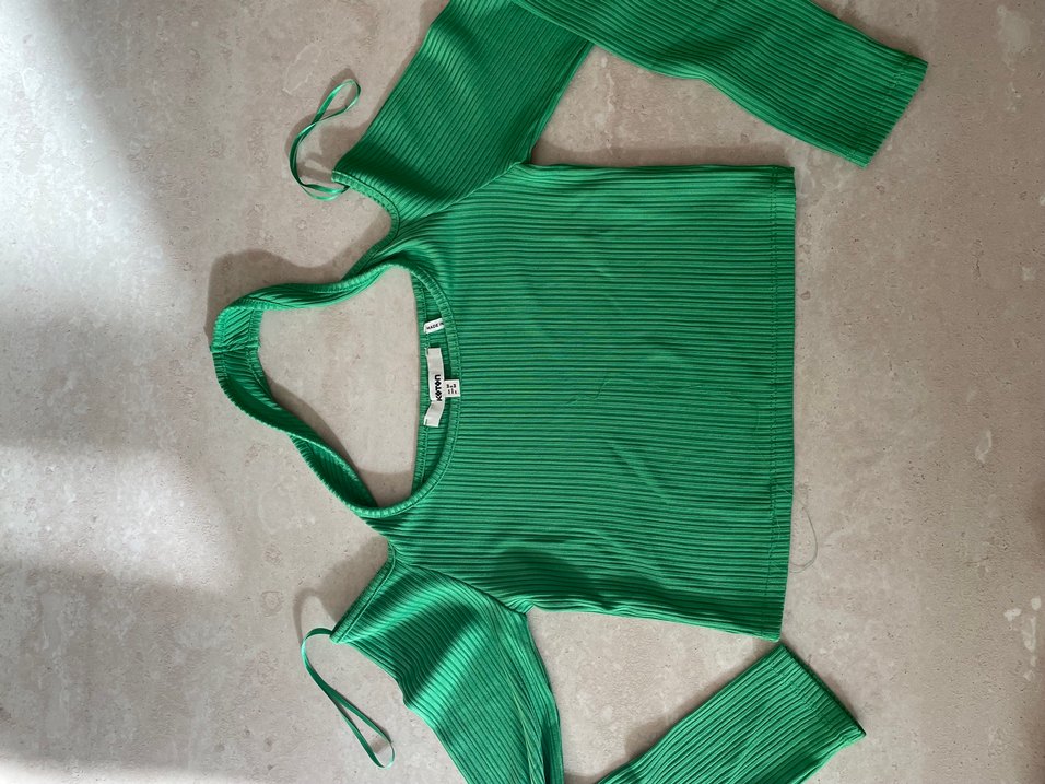 Parlak yeşil renkli, ince askılı ve fitilli dokulu çocuk atleti.