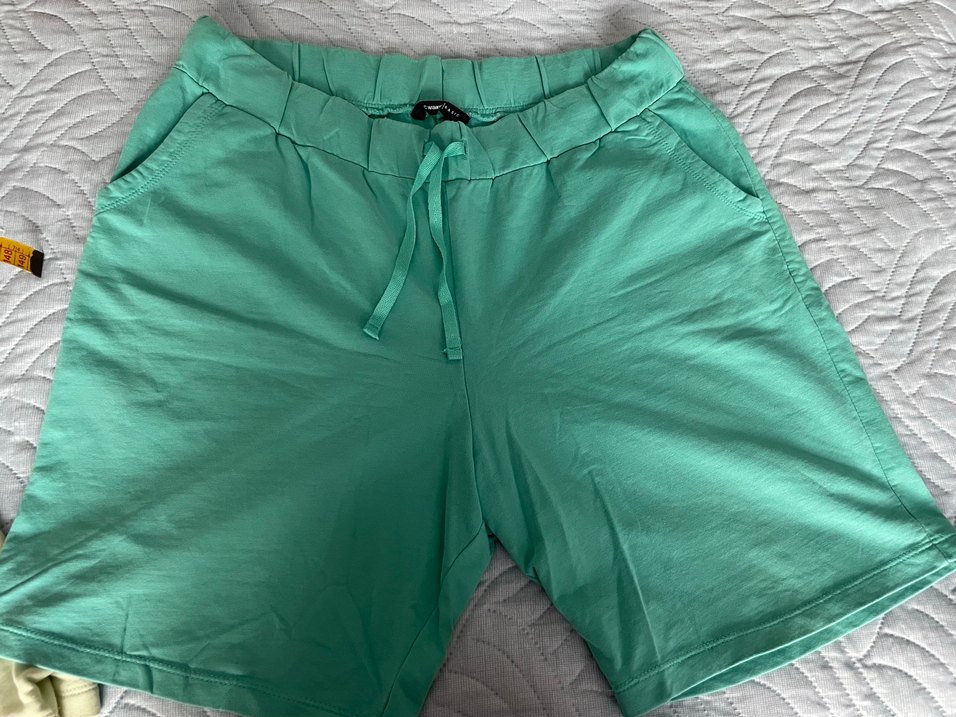 Parlak yeşil renkte, bol kesim ve kemerli şort .Pürüzsüz sentetik kumaştan, rahat dış mekan kullanımı için uygun.