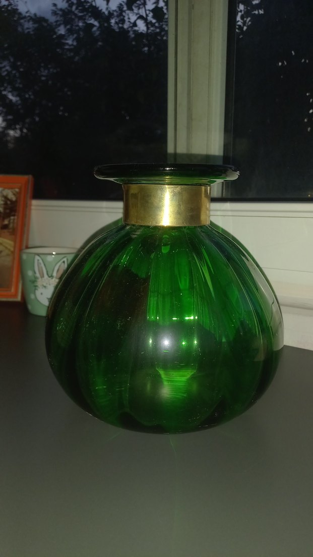 Parlak yeşil camdan yapılmış, geniş ağızlı ve altın renkli metal detaylı yuvarlak vazo.