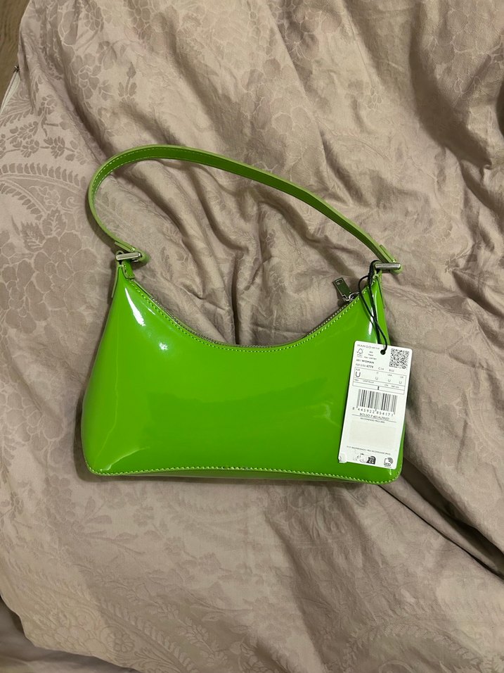 Parlak yeşil deri kadın çanta, fermuarlı ve baskılı detaylı, trend sokak stili için uygun.