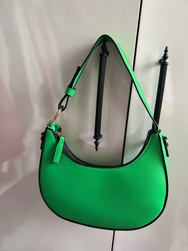 Parlak yeşil deri kadın omuz çantası, tokalı askısı ve minimal tasarımıyla günlük sokak stiline uygundur.