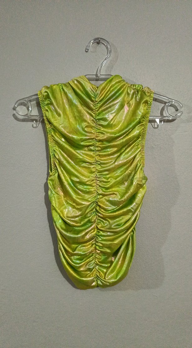 Parlak yeşil tie-dye desenli, drapeli ve vücuda oturan kolsuz bluz. Parti için uygun. ✨ Beden xs ve s ye uygun.