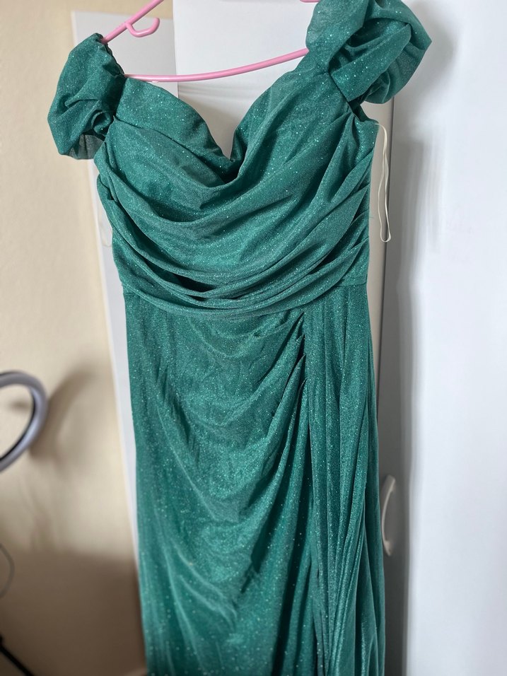 Parlak yeşil kumaştan, straplez ve drapeli uzun abiye elbise. Kolsuz ve vücuda oturan kesimiyle özel davetler için uygundur.
