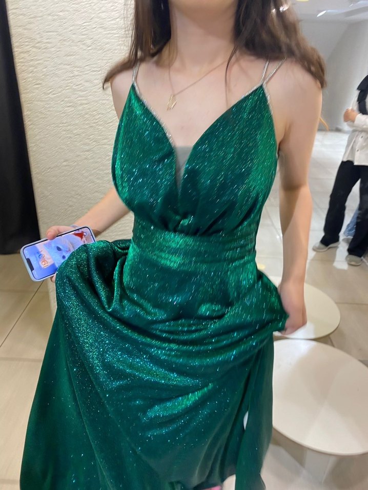 Parlak yeşil kumaştan, drapeli ve askılı uzun abiye elbise, straplez yakası ve ince askıları ile dikkat çeker. ✨