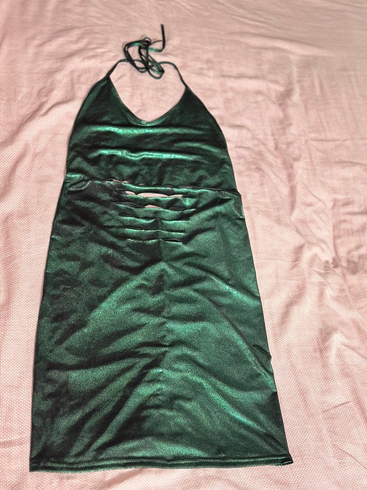 Parlak yeşil renkte, drapeli detaylara sahip, straplez ve uzun boy dar kesim abiye elbisedir. Kolsuz ve dış mekan kullanıma uygundur.