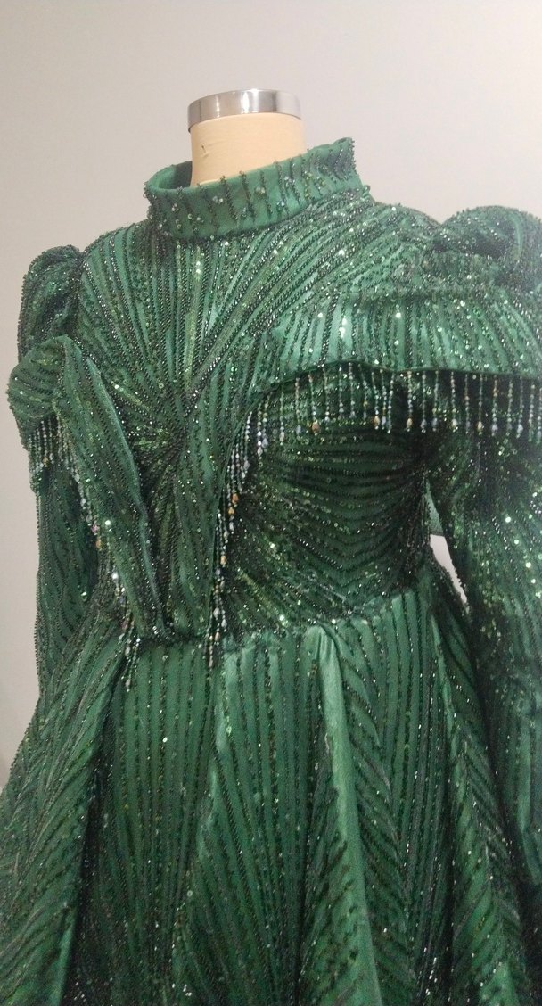 Parlak desenli kumaştan, yüksek yakalı ve askılı kollu, drapeli uzun yeşil kadın abiyesi, şık ve fit kesimlidir. ✨