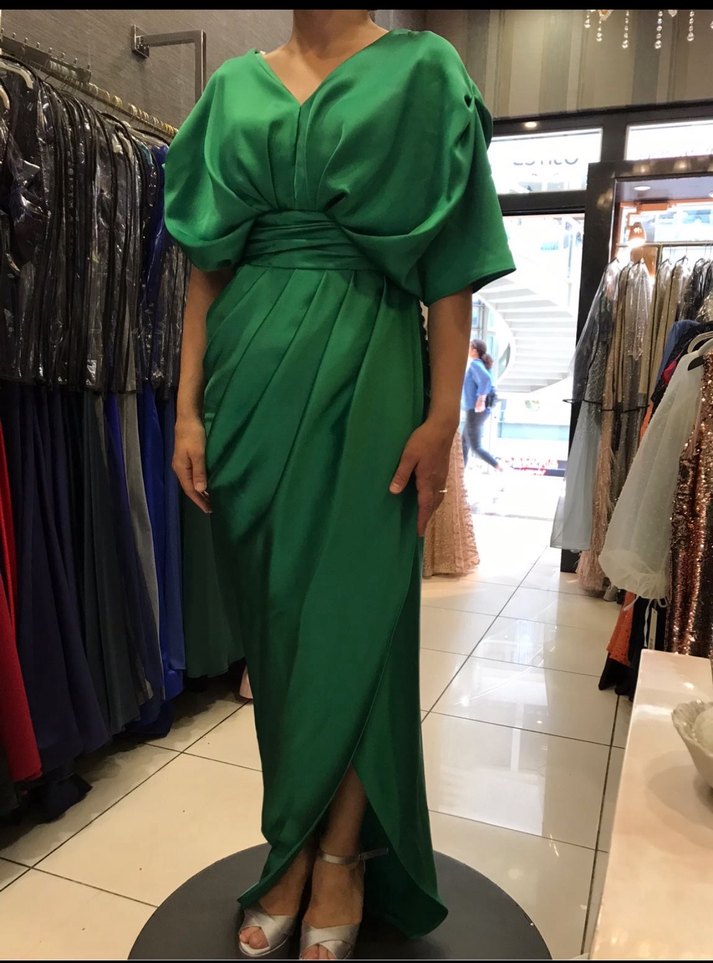 Parlak yeşil renkte, drapeli tasarıma sahip, tek renk uzun elbise. Kısa kollu, tekne yaka ve bol kesimdir. Düğün ve modern tarz için uygundur. 40 beden yazıyor ancak 38 bedene daha rahat gelir. Ankara Karum avm den alındı. Nişanda 2 saat giyildi.