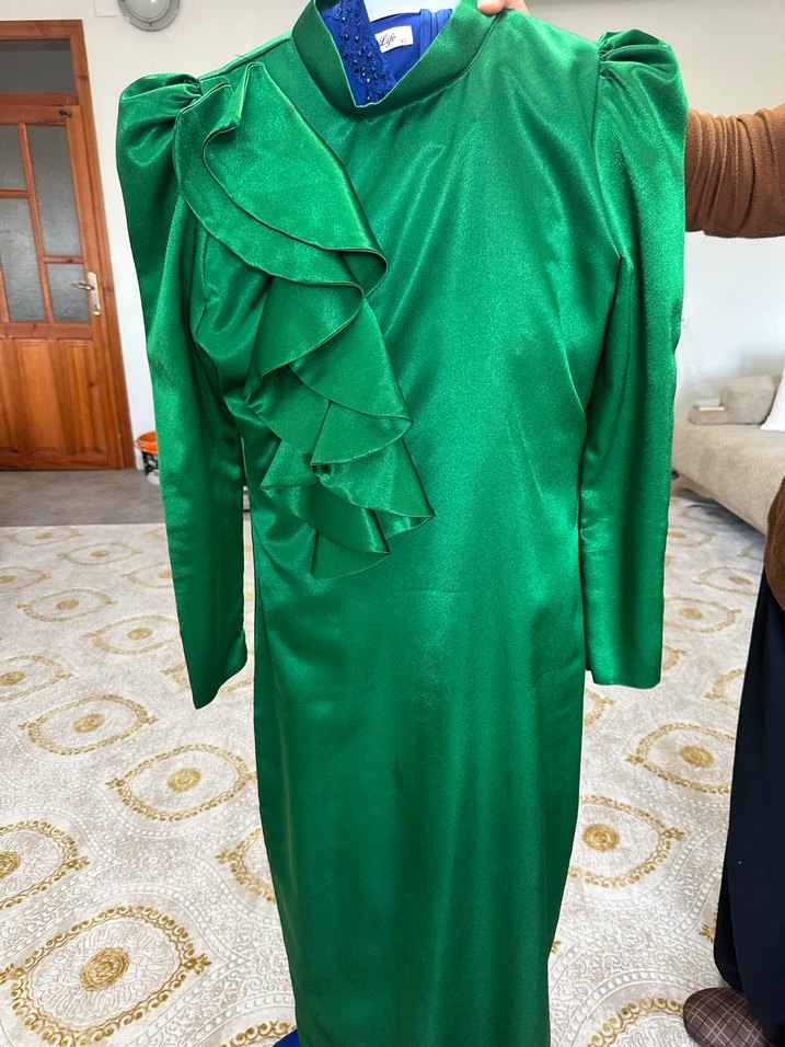 Parlak yeşil renkte, uzun kollu ve yakası kesik detaylı uzun kadın elbisesi. Önde drapeli tasarımıyla şık ve modaya uygun bir görünüme sahiptir. Regular kesim ve klasik tarzda, parti için uygundur.