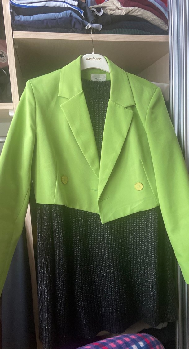 Parlak yeşil renkte, düğmeli ve uzun kollu kadın blazer. Sentetik kumaştan üretilmiş, regular fit ve ofis kullanımı için uygun.