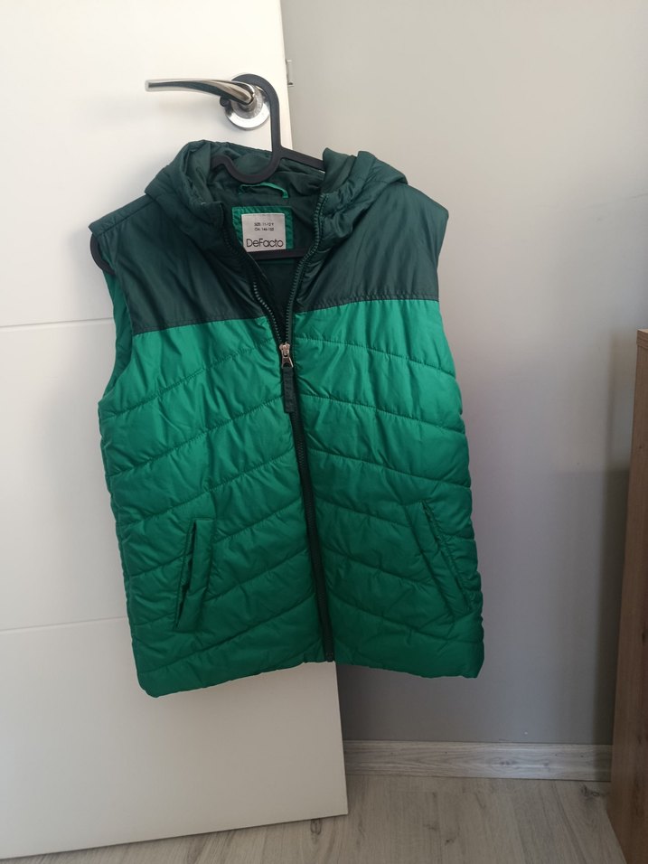 Parlak yeşil renkte, kapüşonlu ve fermuarlı, yüksek yakalı erkek çocuk yeleği. Yumuşak ve sıcak kumaştan, dar kesim ve şehir tarzında.