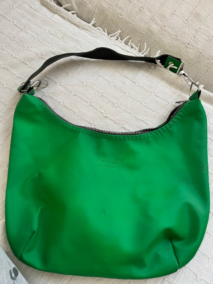 Parlak yeşil renkte, fermuarlı üst kısmı olan kadın çantası. Sentetik kumaştan yapılmış, minimalist tasarıma sahip, günlük ve sokak modasına uygun.