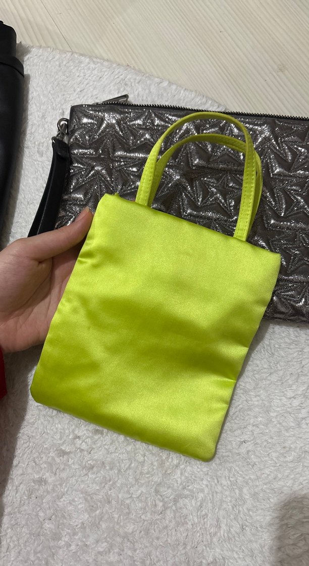 Parlak yeşil sentetik kumaştan fermuarlı kadın çantası. Sokak modası ve minimalist tarzlar için uygun, günlük kullanıma uygun.