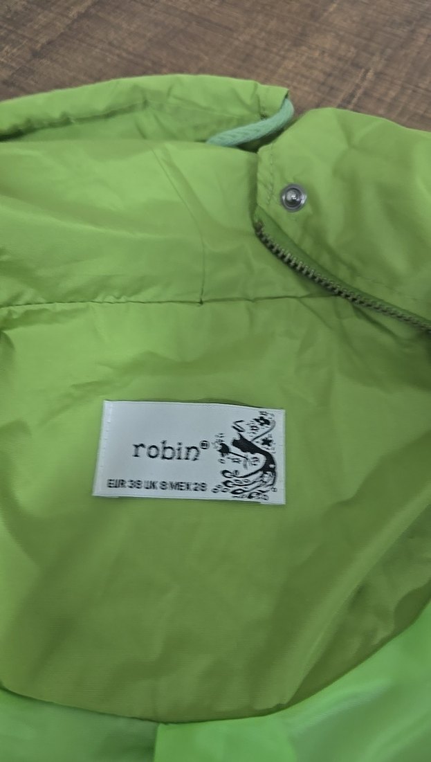 Fermuarlı ve baskılı, parlak yeşil sentetik kumaştan yapılmış, bisiklet yaka, kadın yağmurluk. ️
