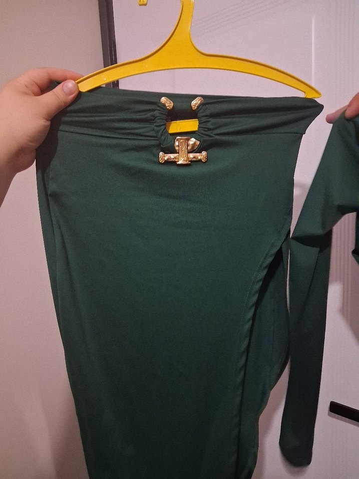 Parlak yeşil renkli, belinde altın tokası olan, vücuda oturan hamile midi eteği, parti için uygun.