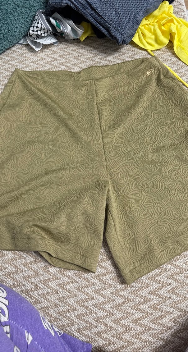 Parlak yeşil sentetik kumaştan, pile detaylı ve bol kesim hamile mini şort, plajda şık sokak stili için uygundur.