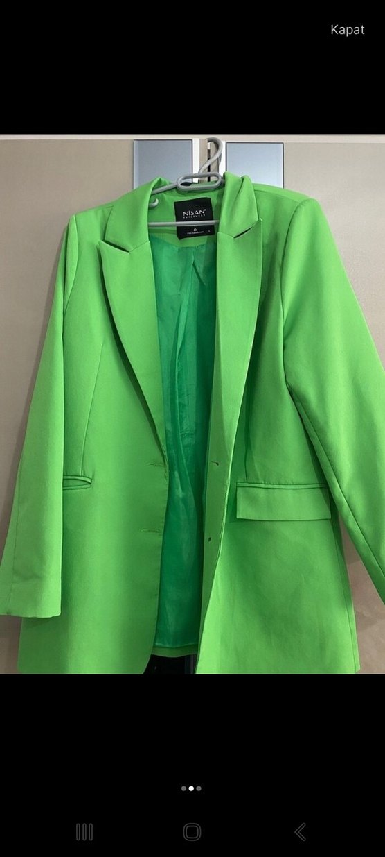 Parlak yeşil renkte, normal boy midi kesim, yakası kesik ve askılı kollu kadın blazer. Sentetik kumaştan, iş ve günlük tarz için uygun. rengi daha tatlı bir yeşil fotoğraftakinden iyi duruyor isteyene özelden atarım görüntüsünü