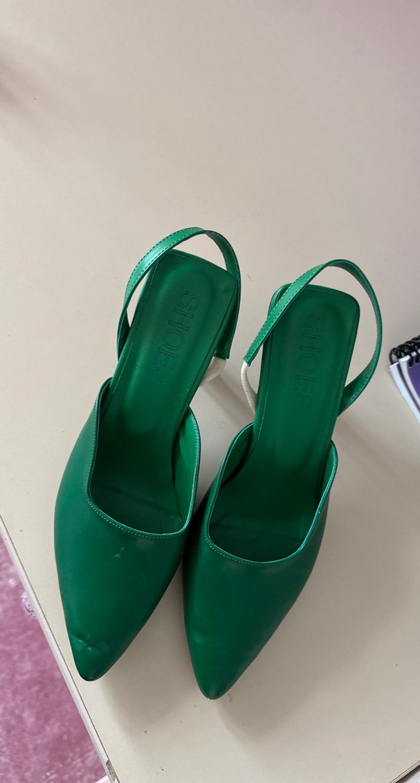 Parlak yeşil renkte, blok topuklu ve desen içermeyen kadın sandaletidir. Kauçuk malzemeden yapılmış olup minimal ve şık tasarıma sahiptir.