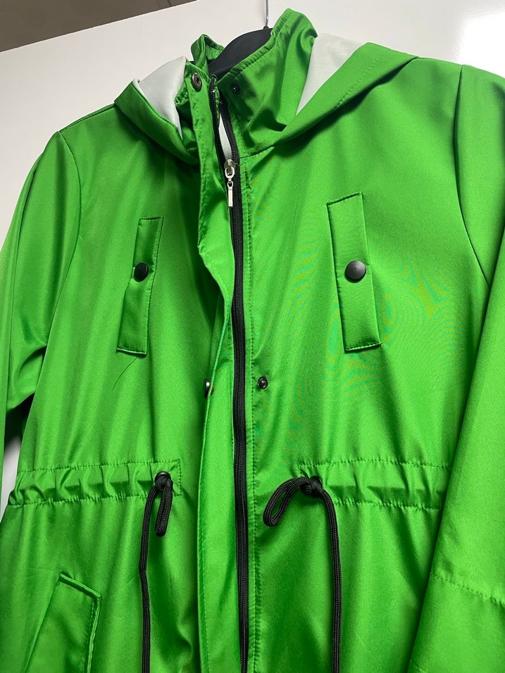 Parlak yeşil sentetik kumaştan, fermuarlı, uzun ve bol kesim kadın yağmurluğu. Kemer detaylı, çarpıcı sokak stili için uygun.