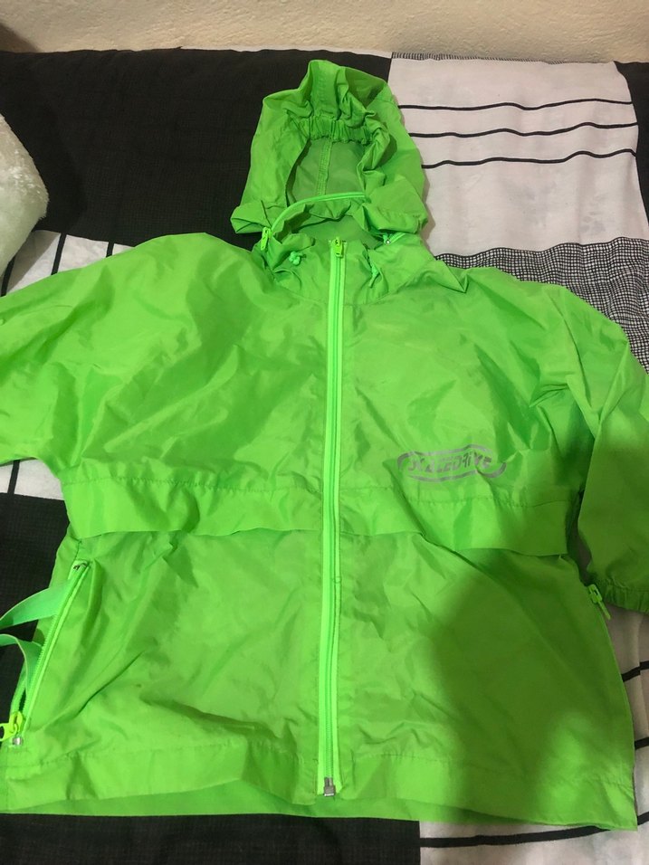 Parlak yeşil renkte, kapüşonlu ve fermuarlı erkek yağmurluğu. Uzun kollu, normal midi boyda, sokak ve athleisure tarzına uygun rahat kesimdir. ️