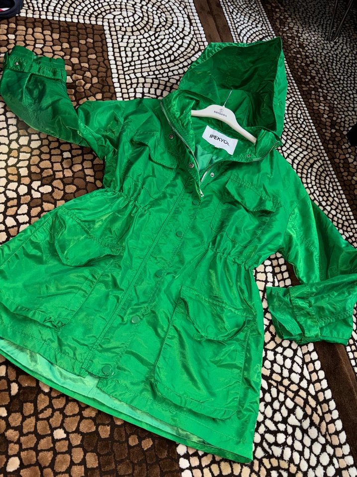 Parlak yeşil renkte, kapüşonlu ve düğmeli kadın yağmurluğu. Midi boy, bol kesim ve uzun kollu, iki ön cepli, sentetik kumaştan.