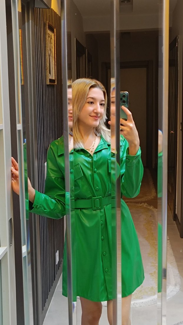 Parlak yeşil deri, uzun kollu ve kesik yaka detaylıdır. Mimi boy ve regular fit modeldir, şık ve parlak dokusuyla dikkat çeker. ️