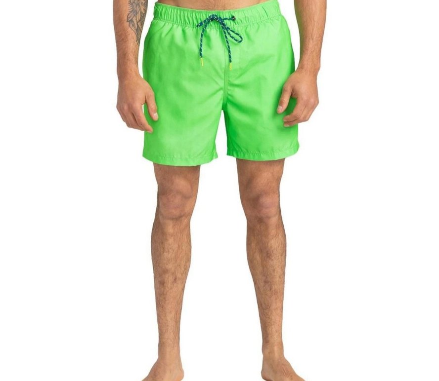 Parlak yeşil renkte, belinde bağcıklı, ince kesim erkek deniz şortu. Sade ve şık tasarımıyla plajda rahat kullanım sağlar.