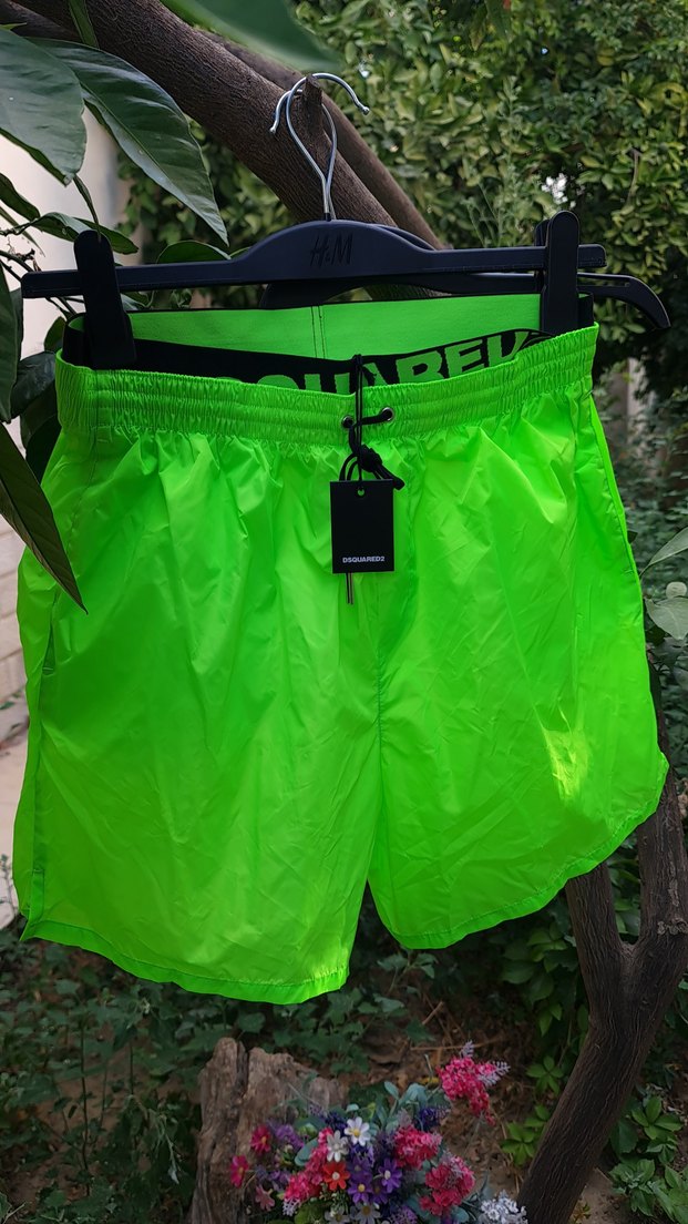 Parlak yeşil renkli, kemerli ve bol kesim erkek mini şort, sokak tarzına uygun ve dış mekan kullanımı için ideal.