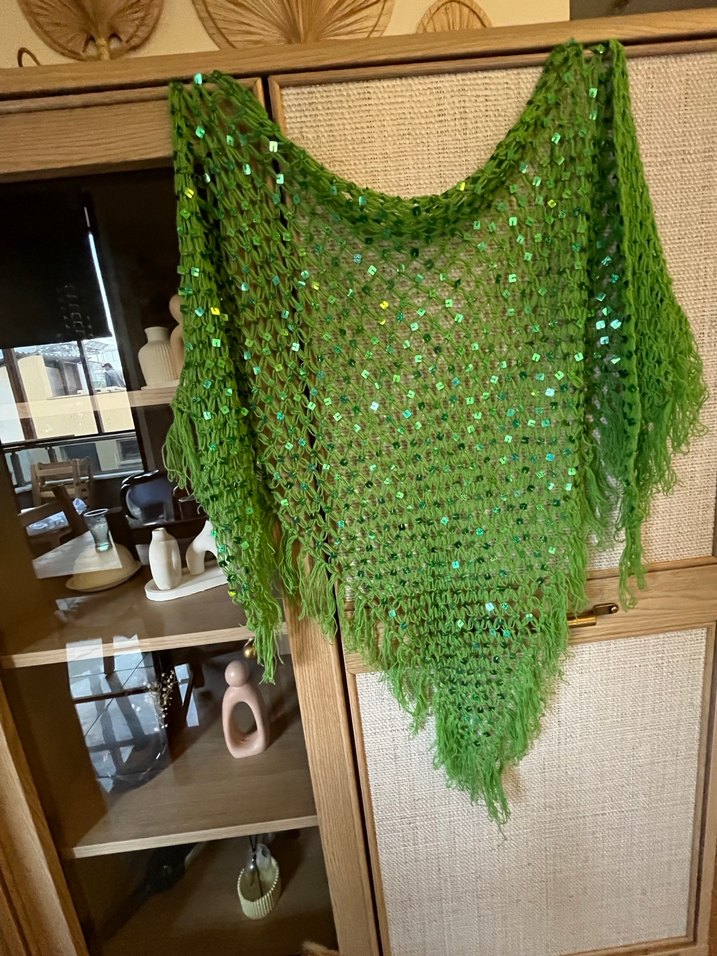 Parlak dokulu, örgü yeşil şal; bohem, retro ve hippie tarzına uygun bir görünüm sağlar.