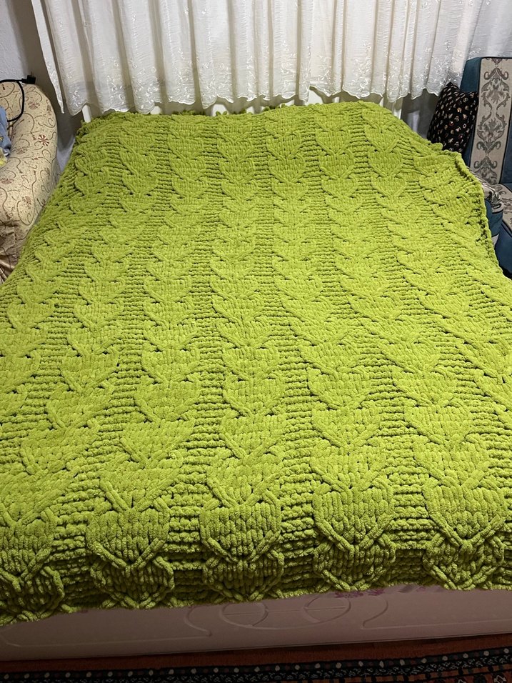 Puffy battaniye yeşil renkli, yumuşak dokulu ve detaylı örgü desenli çocuk battaniyesi, sıcak tutar.