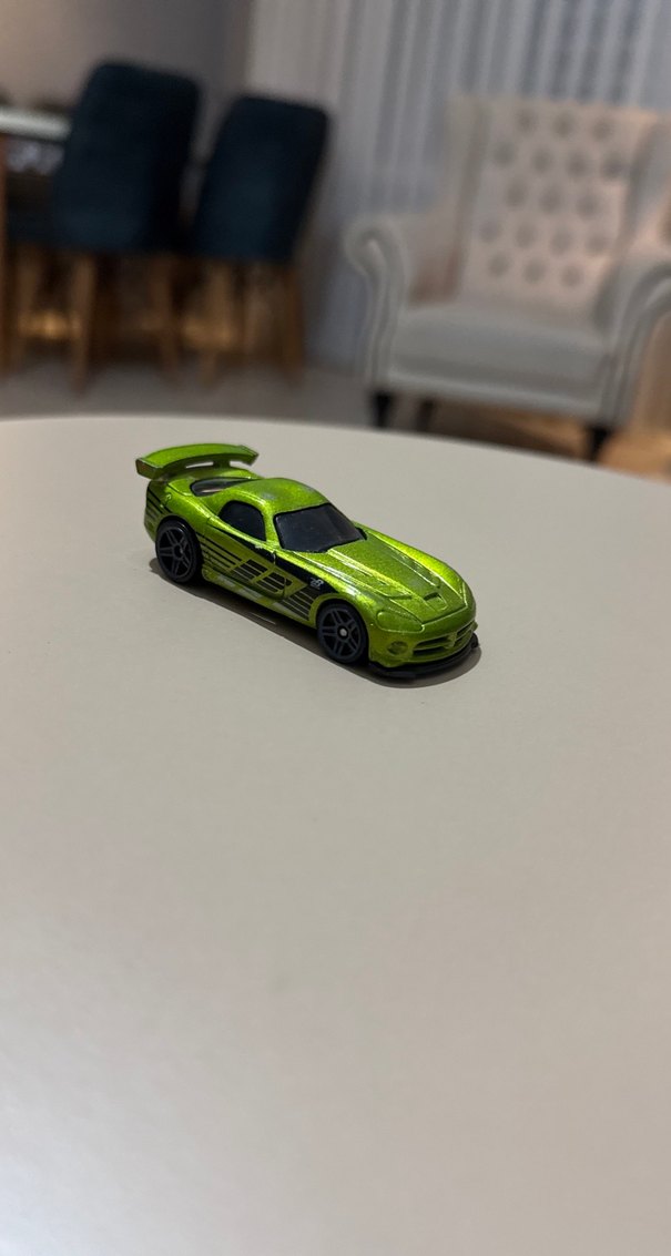 Parlak yeşil renkte, siyah yarış çizgileri ve detaylı tekerlekleri olan oyuncak araba. Küçük boyutlu ve koleksiyon için uygun.