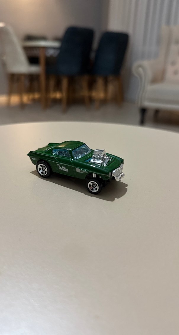 Parlak yeşil renkte, motor detaylı ve sportif tekerlekli oyuncak araba.