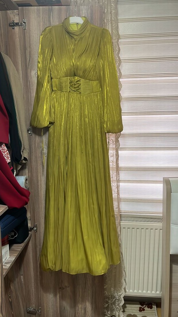 Parlak yeşil pilili kumaştan, straplez yaka ve ince askılı uzun, bol kesim abiye elbise. Klasik zarafet ve vintage bohem tarzına uygundur. 1 kez giyildi.kaliteli