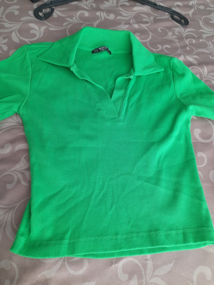 Kısa kollu, yakalı ve parlak yeşil renkte, sentetik kumaştan yapılmış, dar kesim crop polo tişört.