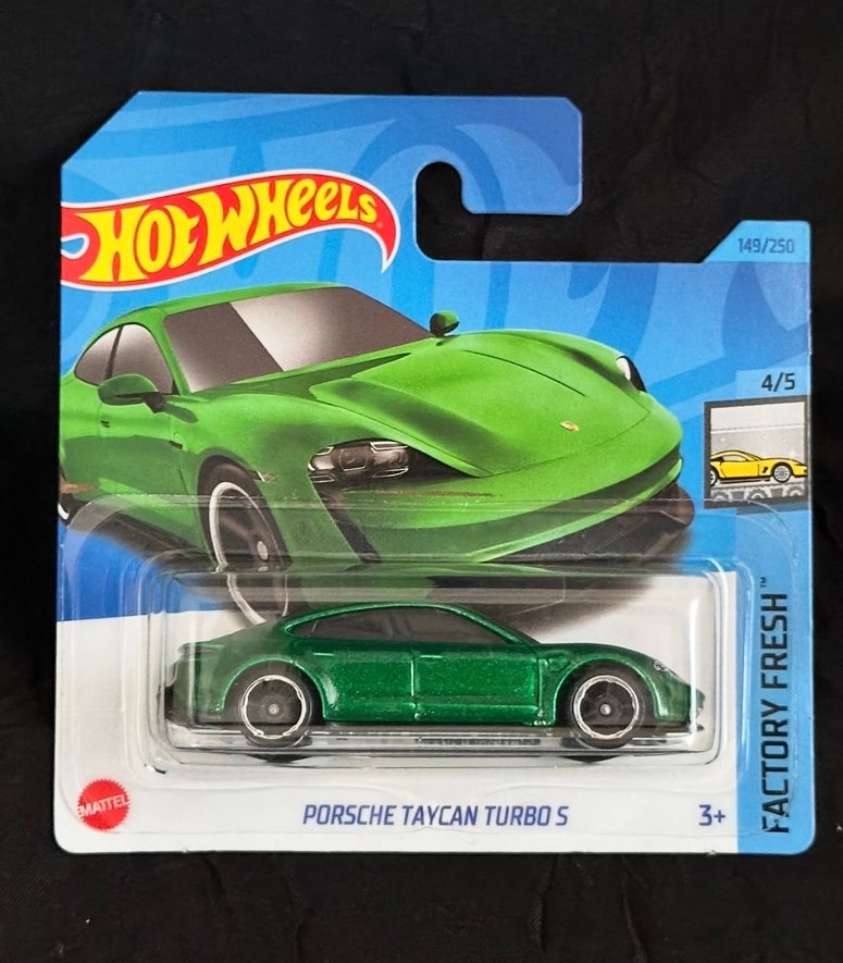 Parlak yeşil renkte Hot Wheels Porsche Taycan Turbo S oyuncak araba, 3 yaş ve üzeri için uygundur.