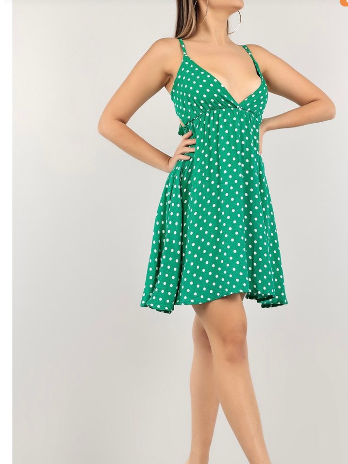 V yaka ve ince askılı, beyaz puantiyeli parlak yeşil mini elbise. Drapeli detaylara sahip, retro pop kültür tarzında, sentetik kumaştan.