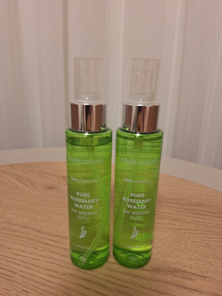 Parlak yeşil sprey şişelerinde saf biberiye suyu, cildi canlandırmak ve nemlendirmek için kullanılır.