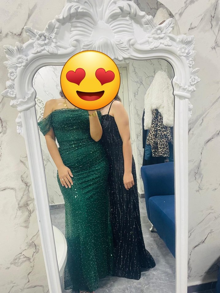 Parlak yeşil, straplez yaka ve ince askılı, simli baskılı kumaştan yapılmış, vücuda oturan uzun abiye elbise, gösterişli partiler için uygun. ✨